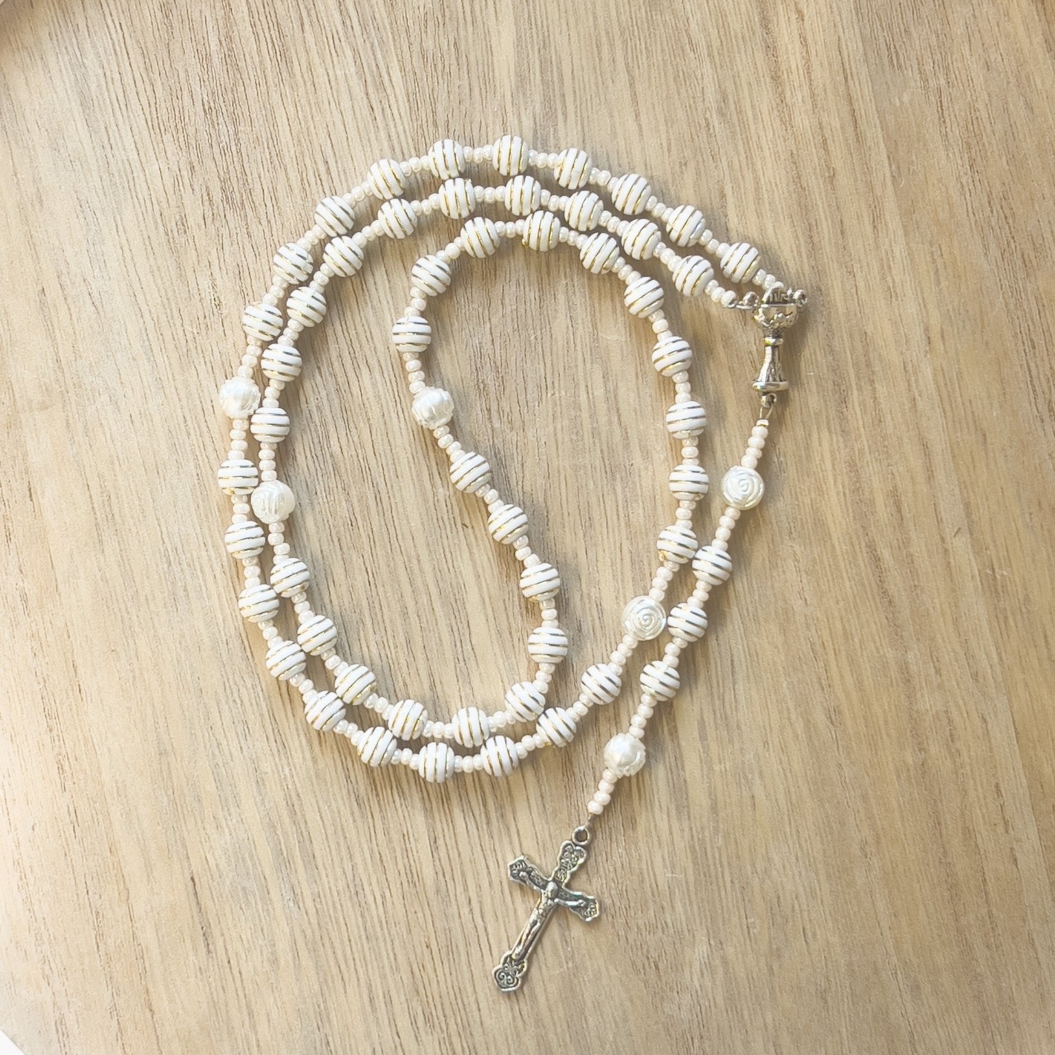 - Beads: Cream-colored acrylic, representing the purity and grace found in the Eucharistic.
