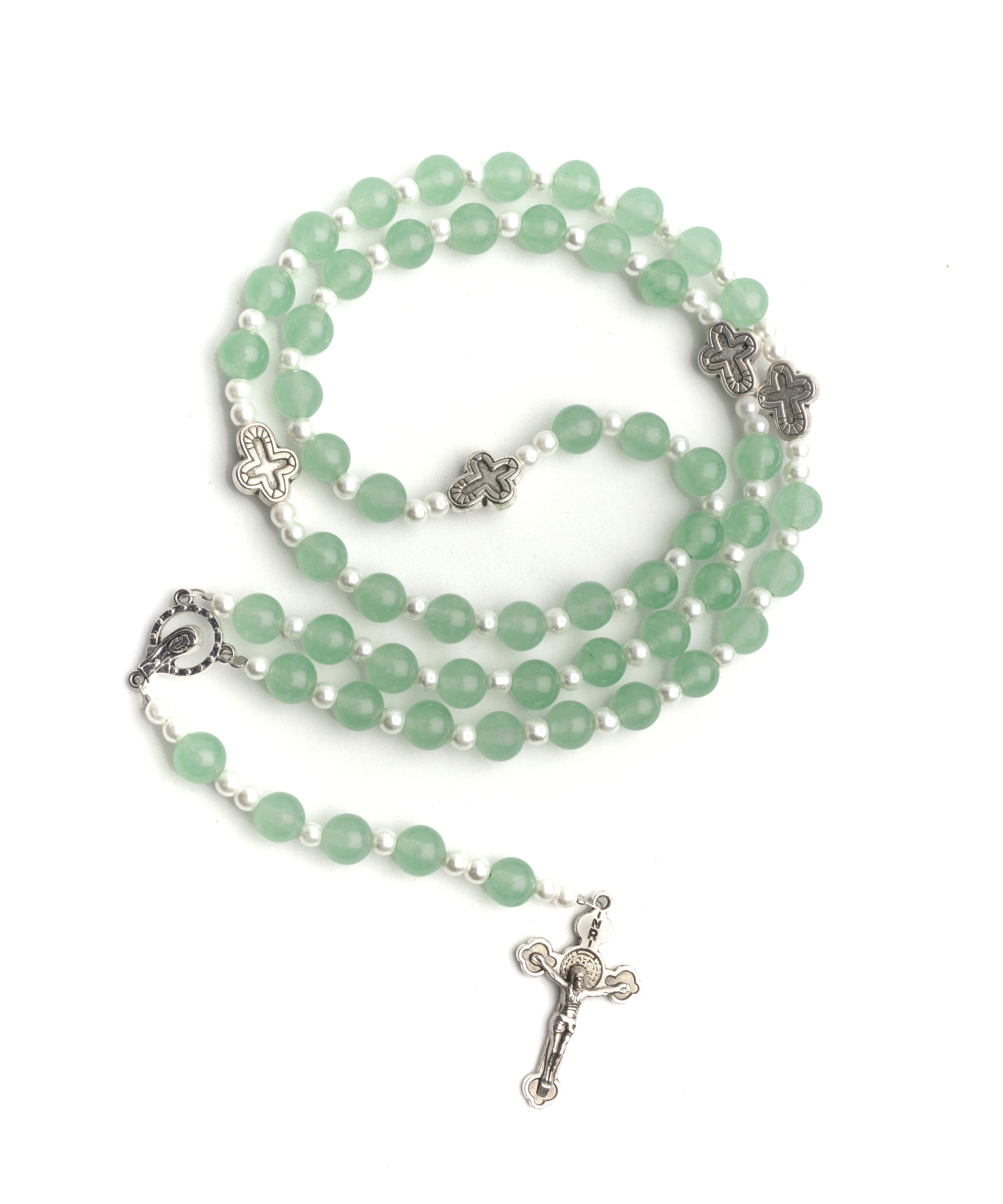 Introducing our Aventurine Crystal Bead Rosary, where traditional elegance meets modern design, inspired by the virtues of Our Lady. This exquisite rosary features green Aventurine crystals, beautifully complemented by silver stainless steel accents, blending the serene hues of green and white in a timeless piece.